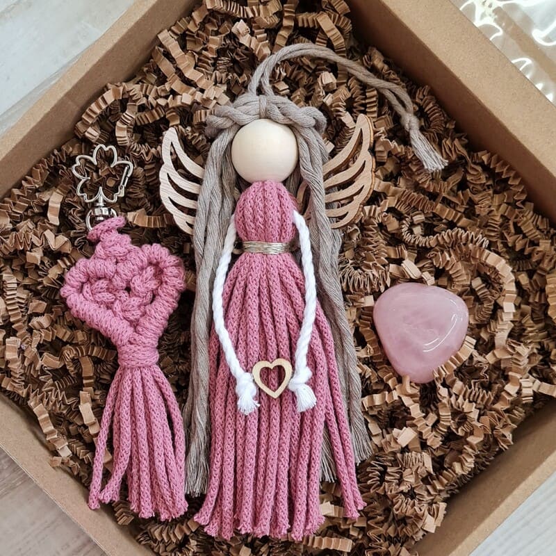 Dárková sada anděl macramé ANEŽKA s dřevěnými křídly s klíčenkou a růženínem
