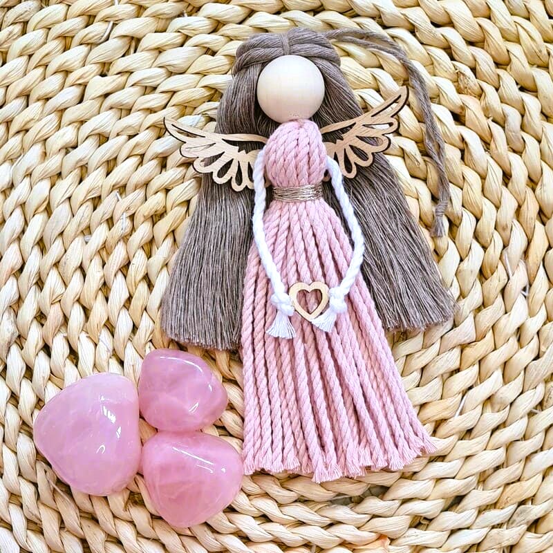 Andílek svou pastelově růžovou barvou působí velmi jemně a nežně. Vyzařuje emoce, lásku, porozumění a otevřenost. Původ jména je keltský a znamená radost, světlo. Andílek je vyrobený z kvalitní bavlněné příze. Pro snadné zavěšení má šňůrku cca 7 - 10 cm. Každý andílek s otevřenou náručí drží dřevěné srdíčko jako symbol otevřeného srdce schopné přijímat i dávat tu nejčistší lásku.