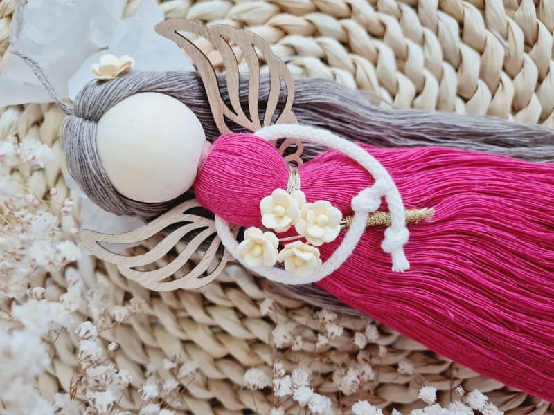 Anděl macramé MALENKA s dřevěnými křídly vhodný jako dárek pro kamarádku, maminku, babičku, či učitelku ve školce. Krásně se bude vyjímat třeba na vašem vánočním stromečku nebo na dveřích pokoje, či na zdi v dětském pokojíčku.