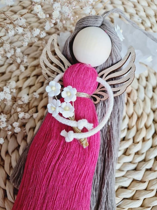 Anděl macramé MALENKA s dřevěnými křídly vhodný jako dárek pro kamarádku, maminku, babičku, či učitelku ve školce. Krásně se bude vyjímat třeba na vašem vánočním stromečku nebo na dveřích pokoje, či na zdi v dětském pokojíčku.