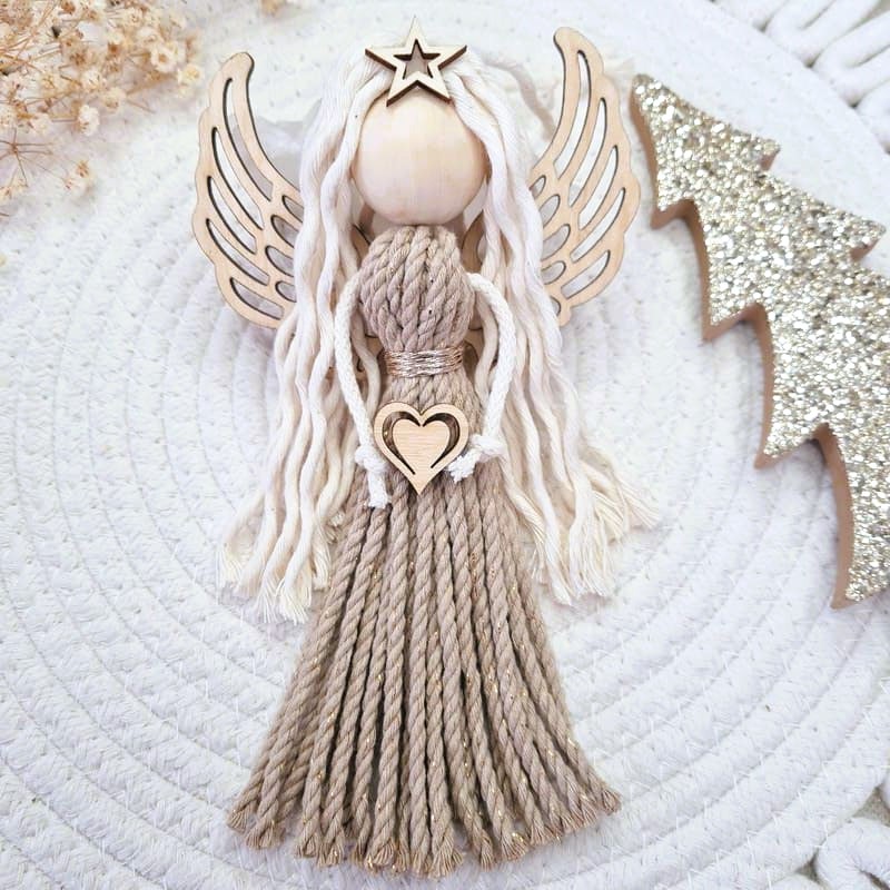 Anděl macramé VÁNOČNÍ HVĚZDA SAND s dřevěnými křídly, vlnité vlasyskladem360 Kč/ ks