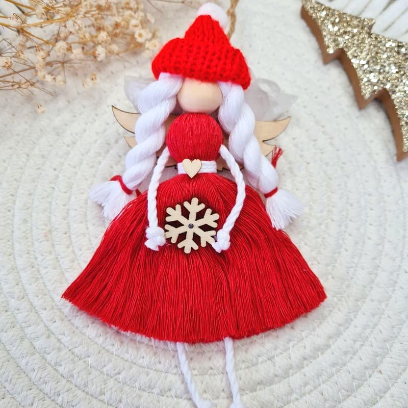 Anděl macramé VÁNOČNÍ KOUZLO v červeném kabátku s dřevěnými křídlyskladem340 Kč/ ks