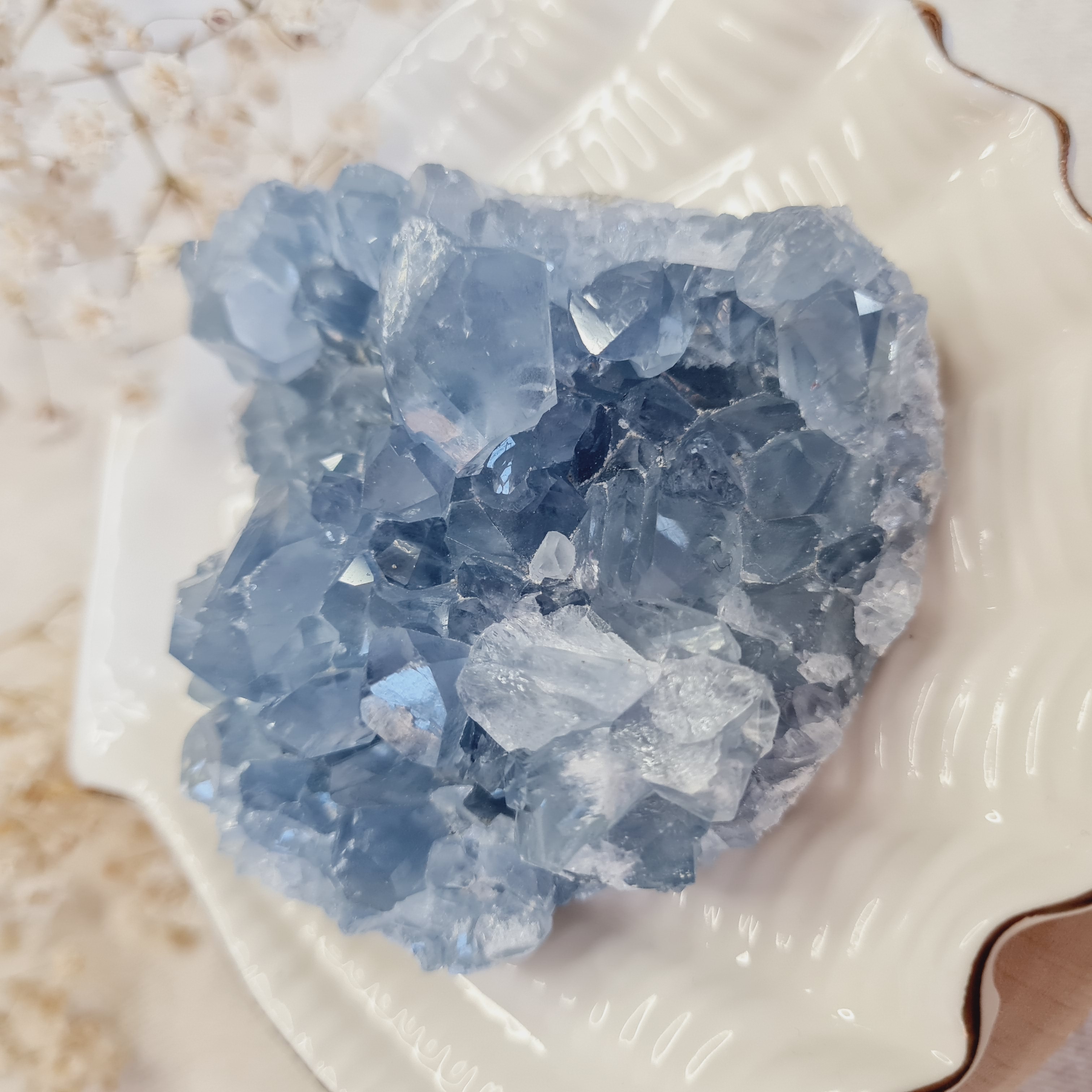 Snová nebeská barva a nebeské vibrace jsou tím, co dává celestýnu takovou nebeskou energii. Jeho vysoké vibrace nám napomáhají na naší duchovní cestě, na cestě k sobě samým, usnadňuje "probuzeni" duše a napojení se na nebeské sféry. Pomáhá nám si vzpomenout na věci které pro naši duši kdysi byly běžné. Pomáhá nám slyšet pravdu a mít oči otevřené. Podporuje hluboký vnitřní klid a mír, pomáhá zklidnit emoce, projasňuje mysl a ukazuje cestu k harmonickemu a naplněnému životu. Pomáhá uklidnit vaše tělo, abyste mohli skutečně odpočívat a relaxovat. Tento všestranný uklidňující účinek činí z celestínu tak silného krystalového spojence, který zmírňuje stres a úzkost, a také je jedním z nejlepších krystalů určených na spaní. Proto je tak oblíbený.