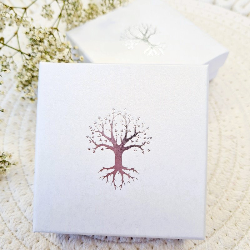 Dárková krabička na šperky. Barva BÍLÁ s potiskem stromu života (stříbrná barva)..