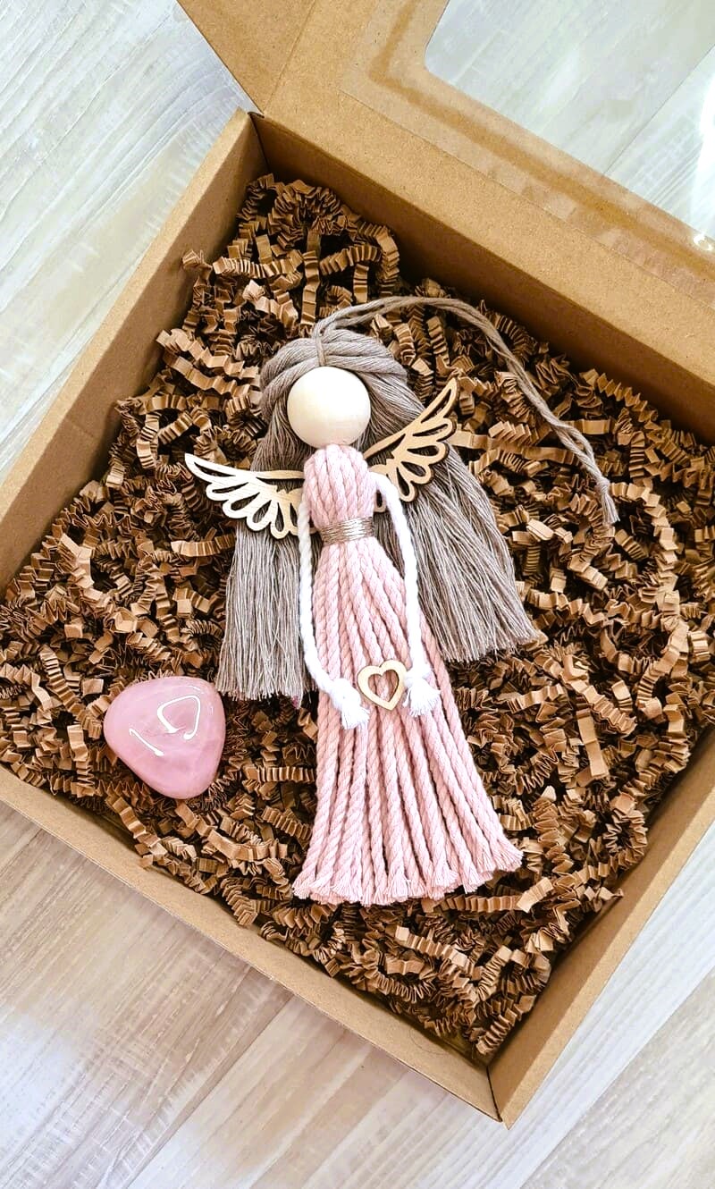 Dárková sada Anděl macramé EVELIN s dřevěnými křídly s růženínem