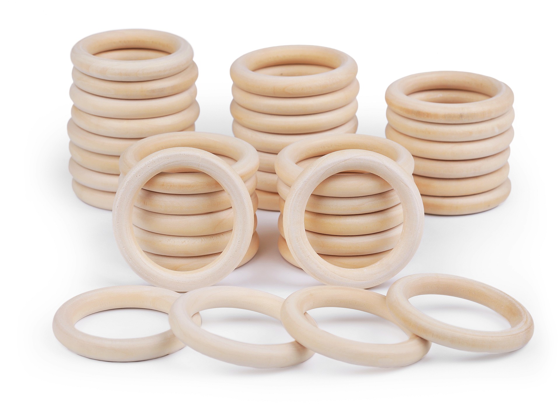 Přírodní dřevěné kroužky pro tvorbu dekorací jako je například macramé. Jsou vhodné také na výrobu náhrdelníků, k uchycení záclony nebo závěsu apod. Kroužky jsou nelakované, tudíž na ně můžete bez potíží malovat.