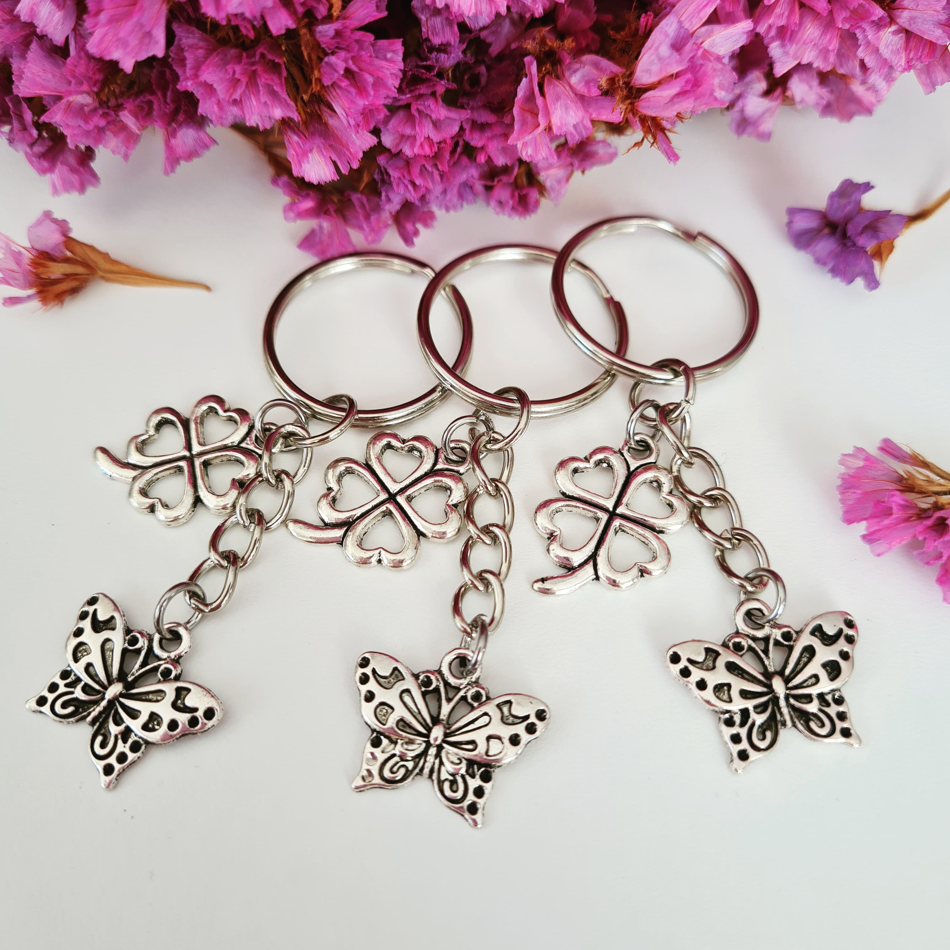 Klíčenka motýlek (velikost 16x20 mm) se čtyřlístkem (velikost 15x21 mm).