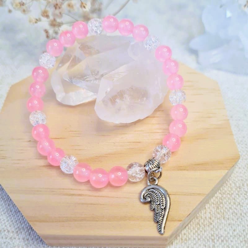 Náramek Jadeit růžový s křišťálem praskaným a s přívěskem andělské křídlo