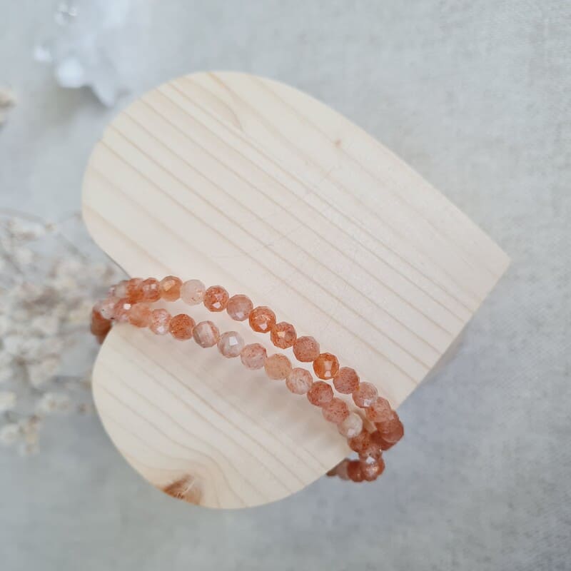 Sluneční kámen charakterizují zlatavé třpytky, které vyvolávají malé částečky červeného hematitu nebo mědi. Fazetování je proces vybrušování hladkých plošek (fazet), nejčastěji mnohoúhelníkového tvaru. Tato povrchová úprava dodává kuličkám z kamenů výjimečný třpyt a náramky z těchto kuliček jsou krásným elegantním doplňkem.